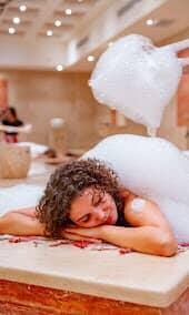 – Hammam, sauna, jacuzzi, massage à la mousse, peeling & enveloppement corporel, Masque facial et Massage 30 minutes